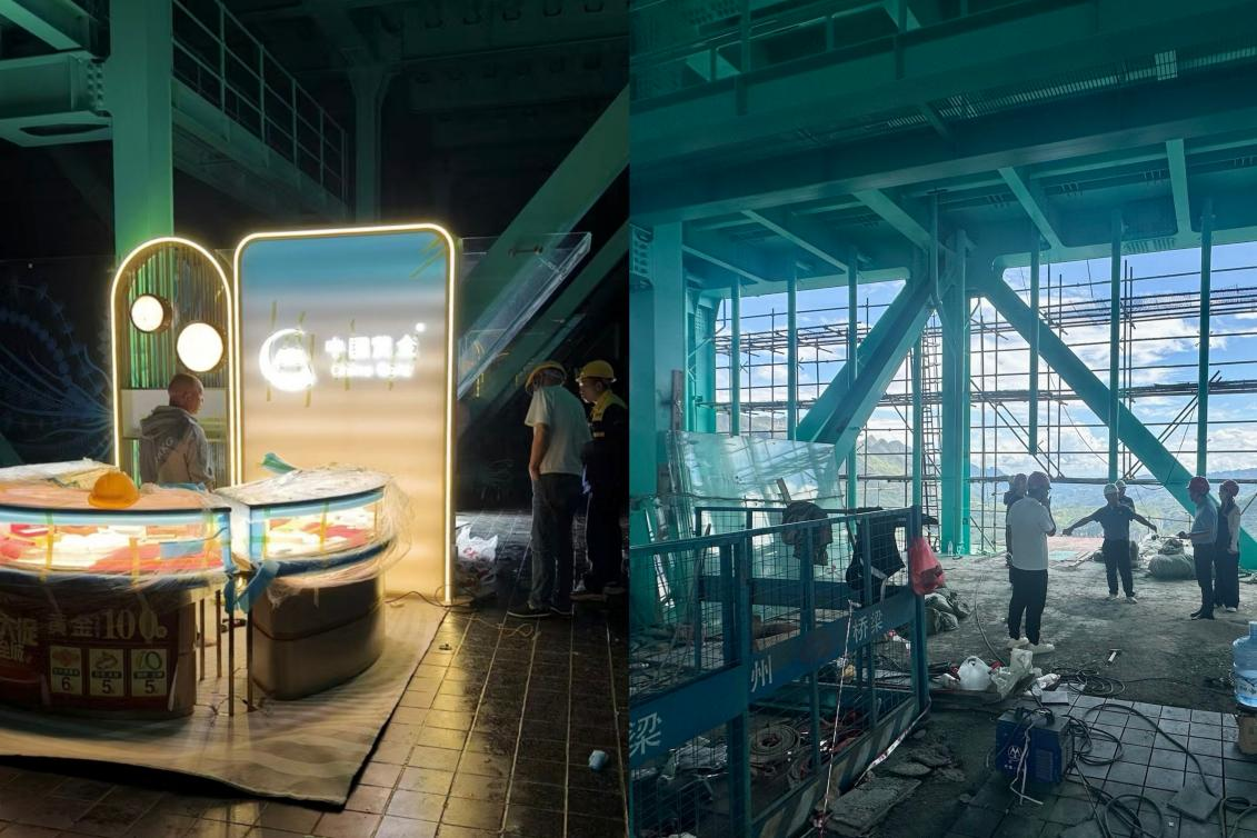 這些精美產(chǎn)品所承載的匠心,同樣體現(xiàn)在它們所在的展示空間之中。接到中金珠寶黨委的工作部署后,中金珠寶加盟管理部(五區(qū))貴州團(tuán)隊(duì)迅速響應(yīng),提前兩個(gè)月進(jìn)駐花江峽谷大橋展開前期準(zhǔn)備工作。彼時(shí)大橋尚未完全通車,橋體未通電,運(yùn)輸成為最大挑戰(zhàn)——所有人員上下橋體只能依靠樓梯步行,要在狹窄的橋體空間內(nèi)搬運(yùn)展柜設(shè)備,只有通過臨時(shí)索道吊運(yùn),一旦遭遇大風(fēng)天氣,作業(yè)就得暫停便被迫中斷。在如此極限的環(huán)境下,團(tuán)隊(duì)全員堅(jiān)守一線,與時(shí)間賽跑,最終圓滿完成展示區(qū)建設(shè),以實(shí)際行動(dòng)詮釋了中金珠寶人的執(zhí)行力與責(zé)任擔(dān)當(dāng)。
