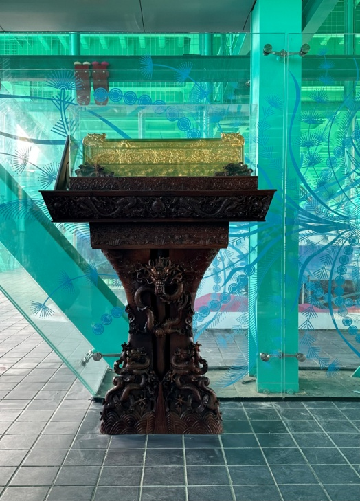在大橋中段玻璃棧道旁,中金珠寶設(shè)立了文化展示區(qū),展出由高純度黃金(Au99.999)鑄造的“華夏五九至尊金”。該作品以中國傳統(tǒng)龍紋為設(shè)計(jì)元素,復(fù)刻了故宮九龍壁的威嚴(yán)氣勢(shì),成為游客爭(zhēng)相打卡的“黃金地標(biāo)”。